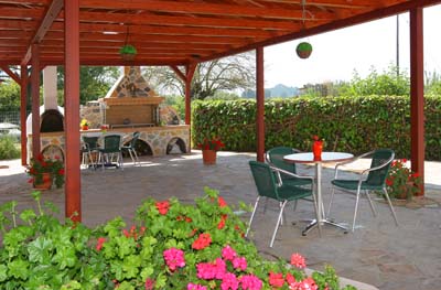 Η μονάδα μας περιβάλλεται από έναν καλοπεριποιημένο Κήπο 1500τ.μ.,  Αίθριο με Barbecue και Παραδοσιακό Φούρνο, χώρο Parking .